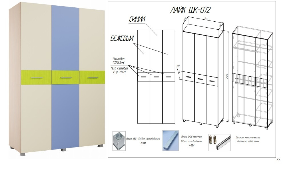 • Шкаф трёхстворчатый состоит из секции с полками (шириной 1/3 шкафа) и секцией с полкой и 2мя штангами (шириной 2/3 шкафа), данные секции универсальные, могут располагаться с любой стороны, для этого необходимо выбрать расположение отверстий под перегородку на верхней и нижней крышке.